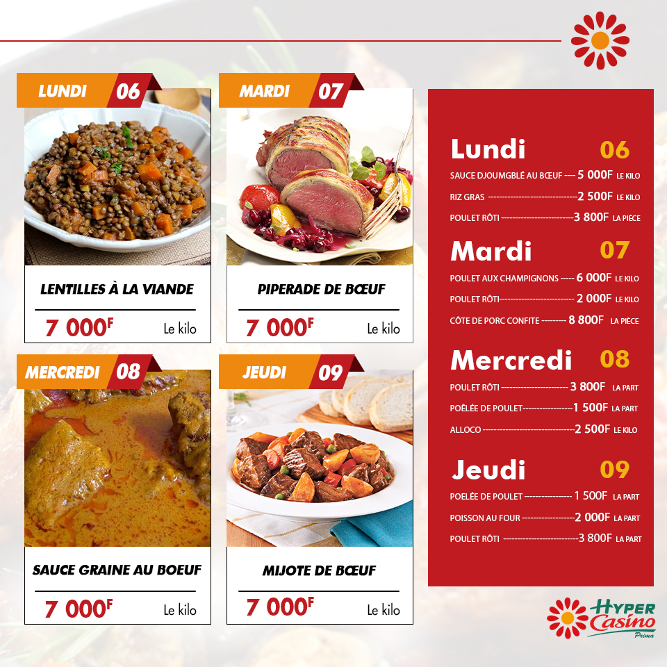 Menu de la semaine #1 Lun/Mar/Mer/Jeu : Casino Côte d'Ivoire (Prima)